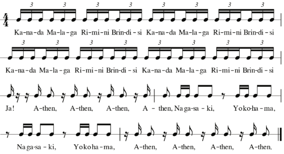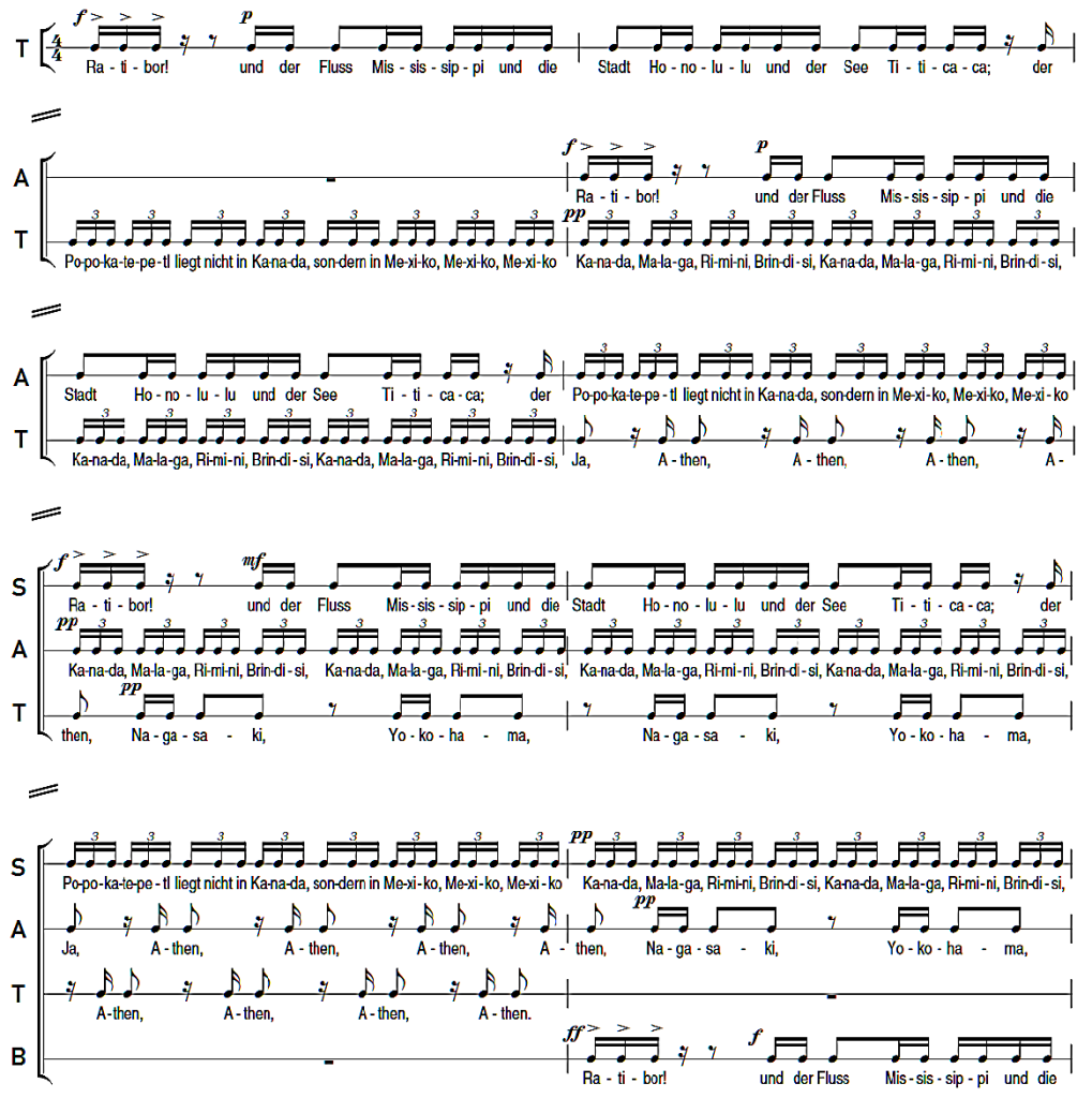 Zwar erfüllt der Satz wesentliche Gattungsmerkmale einer Fuge:  Die vier Stimmen setzen imitativ mit einem Thema ein, es gibt ein Kontrasubjekt, Augmentationen und Diminutionen. Doch wird die Ernsthaftigkeit, die mit dem strengen kontrapunktischen Satz assoziiert wird, sogleich durch den sinnfreien Text aus geographischen Namen humorvoll gebrochen. Zudem schließt Toch ein entscheidendes Element kontrapunktischer Arbeit von vornherein aus, indem er für einen Sprechchor komponiert: die aufeinander bezugnehmenden Tonhöhenbewegungen verschiedener Stimmen. Instrumentalmusik entstand, die es wohl fast vergessen machen mag, daß ihrer Hervorbringung nur ein Sprechen zugrunde liegt.“